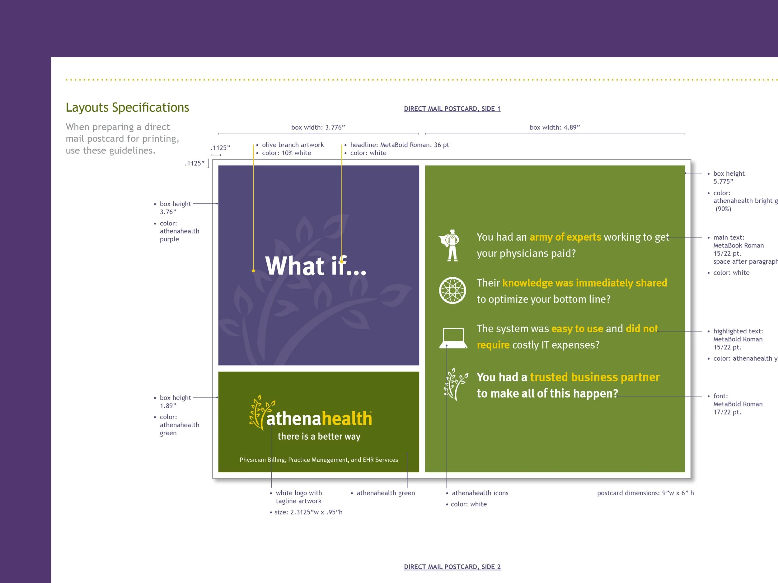 Mary Jo partnered with exUrban Inc. to refresh athenahealth’s identity, including the logo, creative assets and several key marketing pieces. The new system revolved around an updated olive branch from past branding, with cleaner looks throughout. They also created and executed a new digital brand style guide for the company.