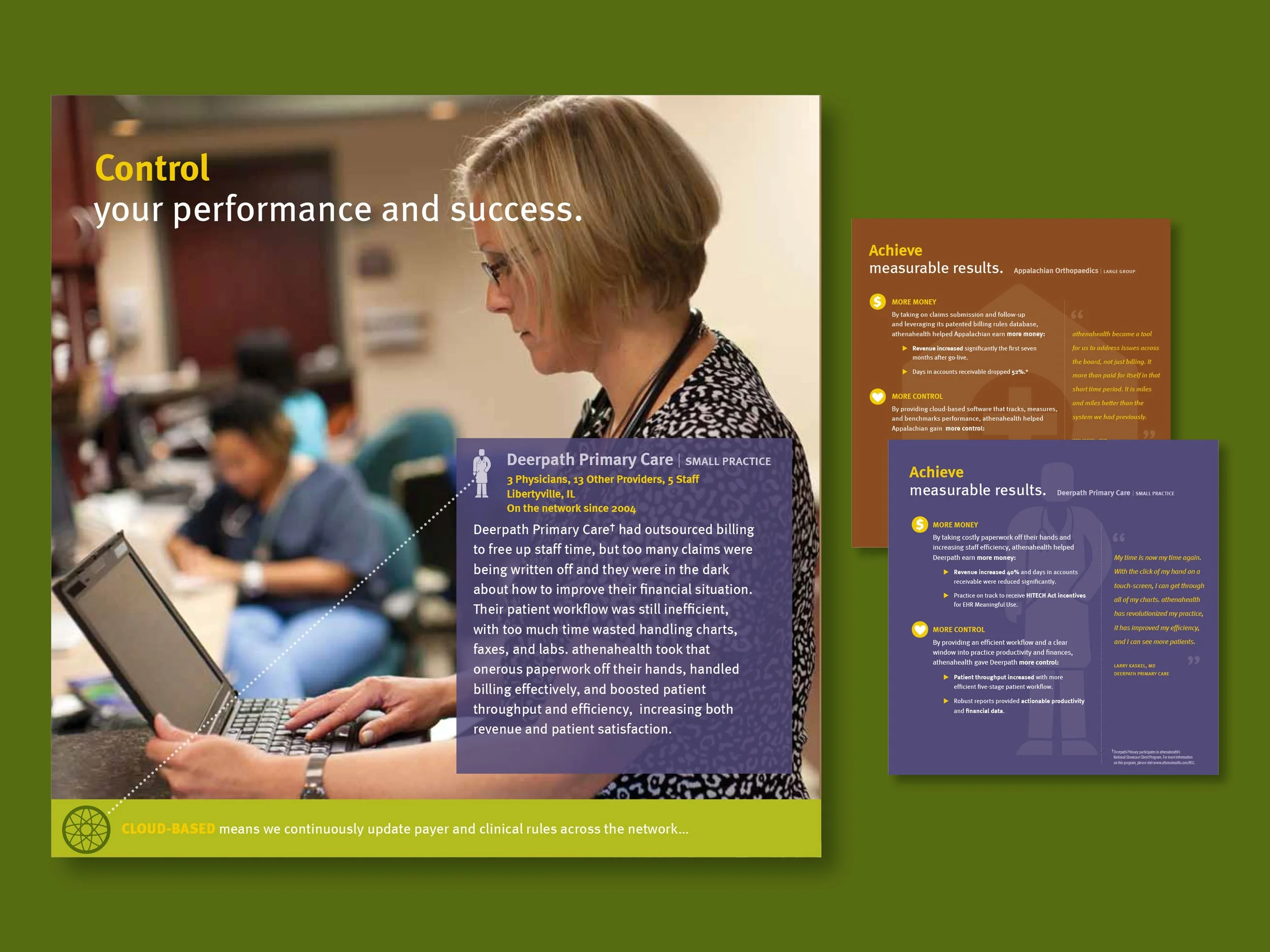The extensive design work included logo and color palette refresh, style guide, collateral, stationery, powerpoint templates and a corporate brochure. Subsequent projects included developing collateral design templates for athenahealth’s internal marketing team.